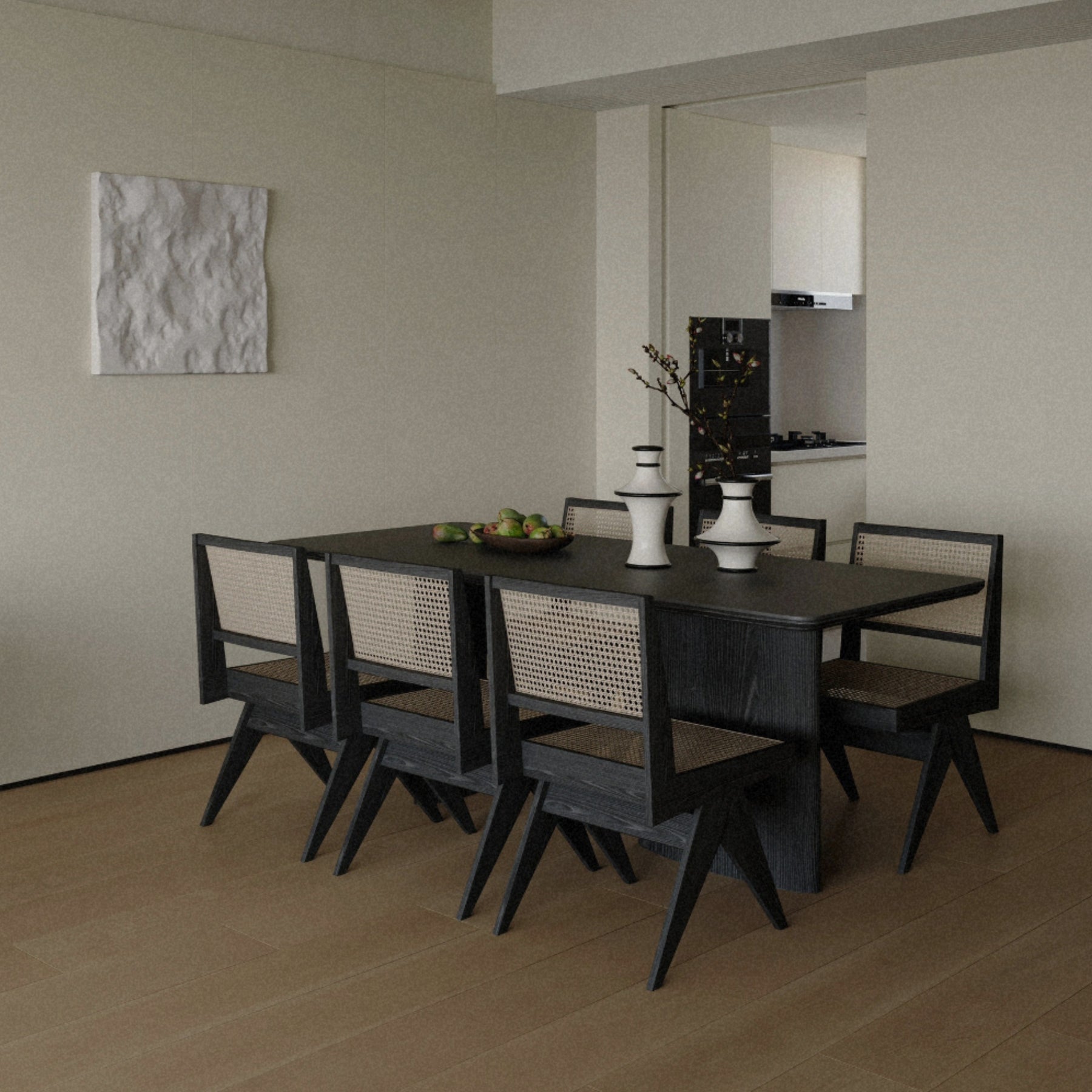 Thrown in white with two dark rings marking the waist and the base, the form wide at the foot and open at the neck. For tables where the piece holds its ground regardless of what grows from it.