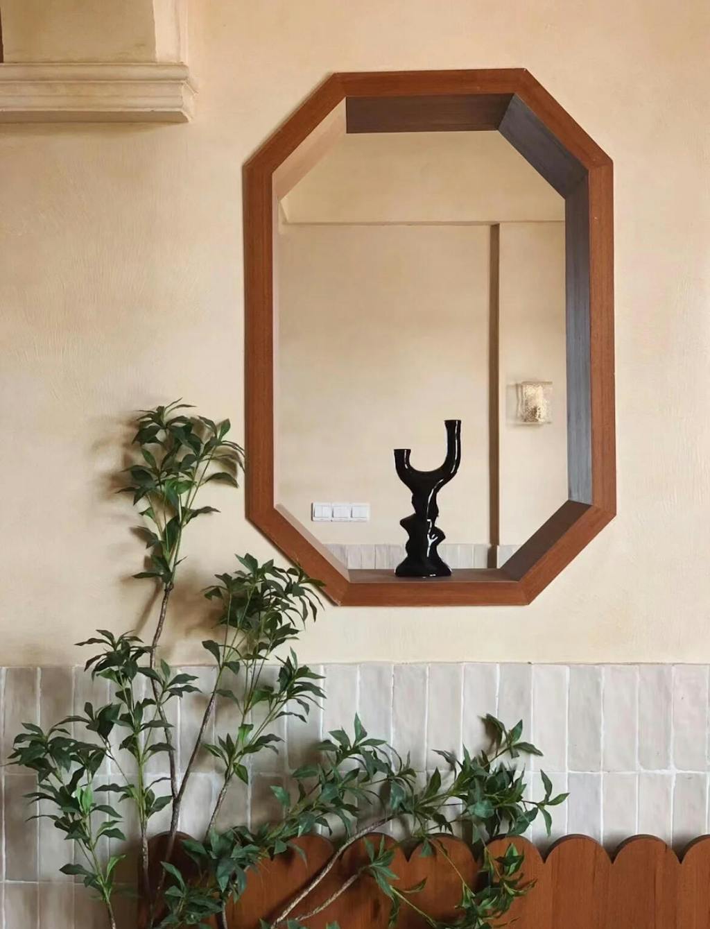 Glazed black and irregular along the full body, forked at the top into two candle arms. For interiors where the object on the shelf needs no context to hold its position.