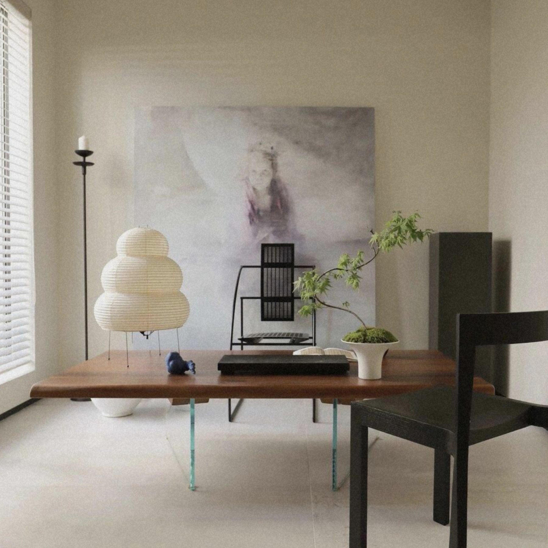 Three ribbed washi volumes, stacked in descending proportion on a narrow metal base. Selected for residential interiors where light is kept low and contained.